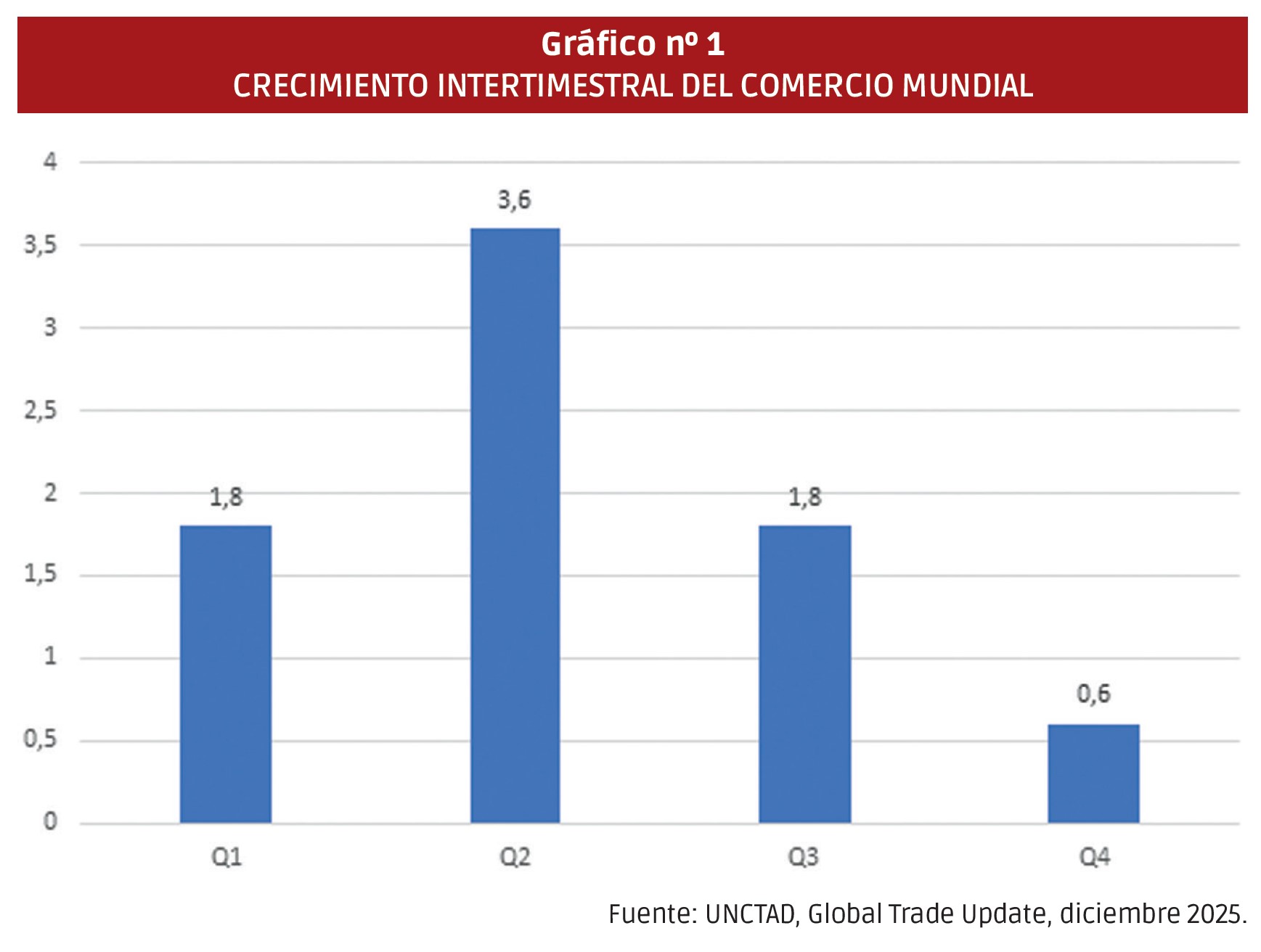 Las últimas predicciones de la UNCTAD (Global Trade Update, diciembre 2025) confirman ese sólido crecimiento del comercio de bienes en términos intertrimestrales, pero constatan también una rápida desaceleración del mismo en los dos últimos cuatrimestres del año (Gráfico nº 1).