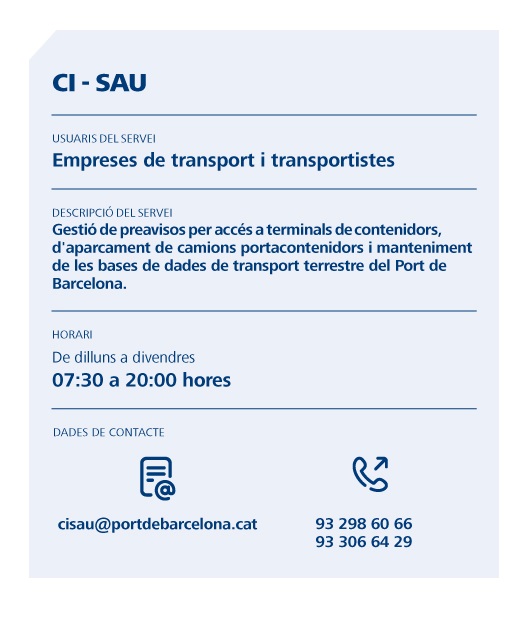 CTA (Container Tracking Application): sistema de trazabilidad de contenedores desarrollado por el Port de Barcelona que agrupa y trata todos los datos generados en una operación marítima desde diferentes fuentes, mostrándolos de forma sencilla y visual. El Port de Barcelona proporciona así al cargador una herramienta para tener el control sobre sus contenedores, con la posibilidad de conocer en cualquier momento toda la información relacionada.