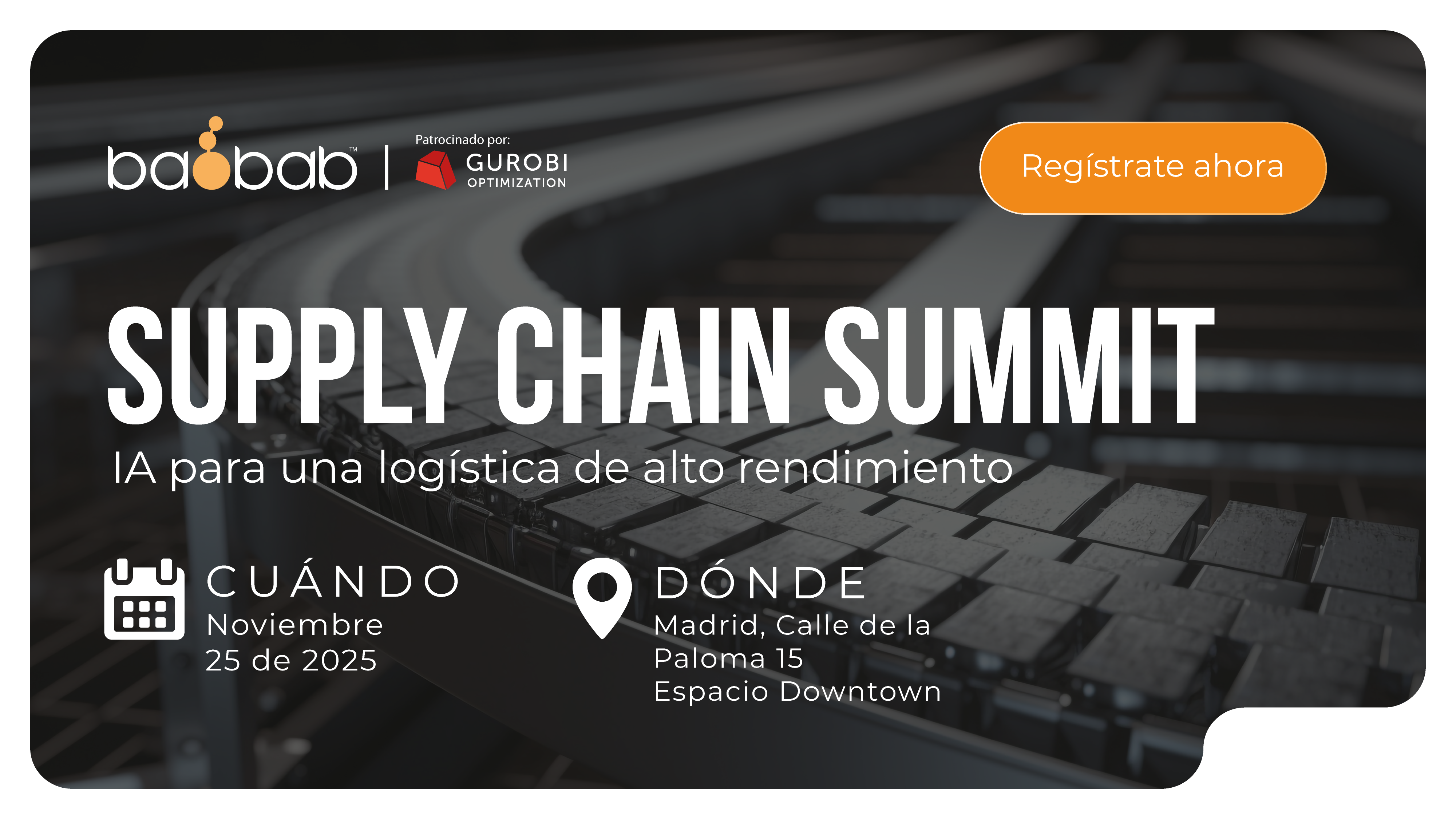 El próximo 25 de noviembre en Madrid reunimos a líderes del sector logístico para recorrer, de la mano de expertos, las decisiones más complejas de la cadena de suministro y cómo optimizarlas con ayuda de la Inteligencia Artificial. Un evento exclusivo, con aforo limitado, pensado para directivos y responsables que buscan anticiparse al futuro del sector.